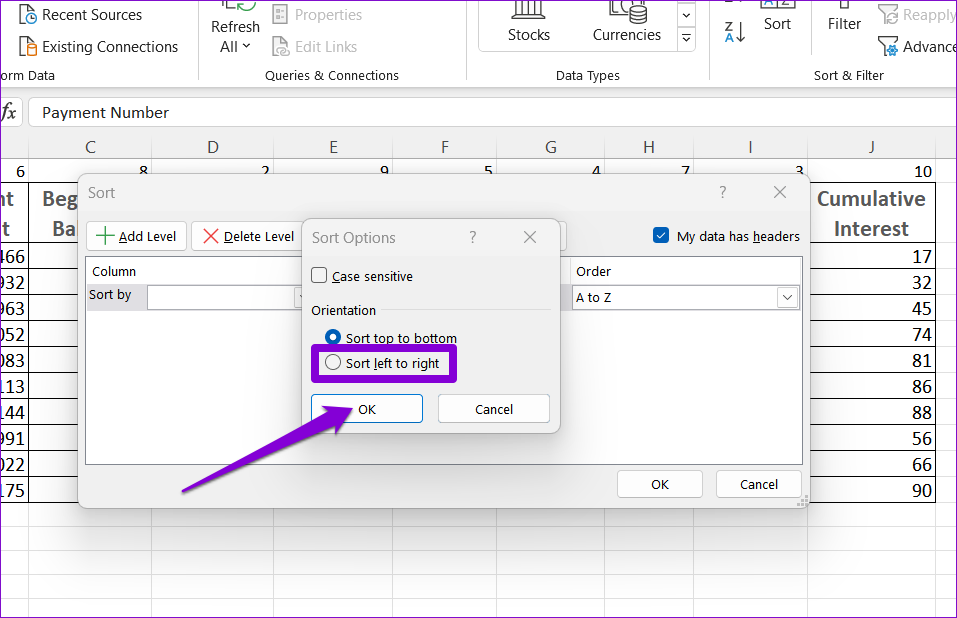 Étape 5 : Sous Orientation, sélectionnez”Trier de gauche à droite”et cliquez sur OK.