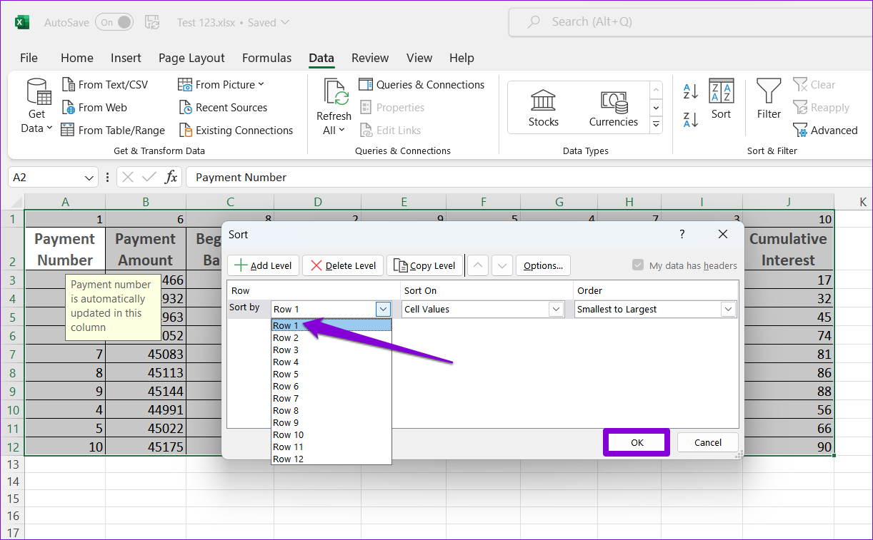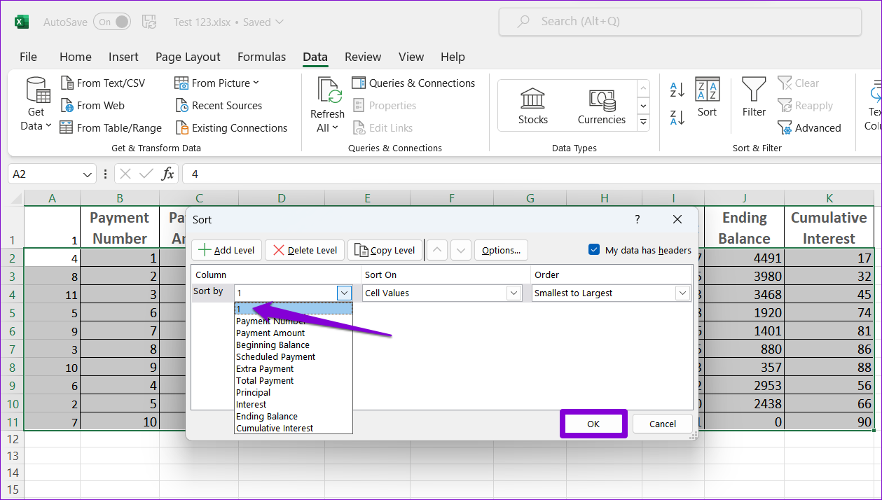 Étape 6 : Cliquez sur le menu déroulant à côté de Trier par et sélectionnez 1. Ensuite, cliquez sur OK.