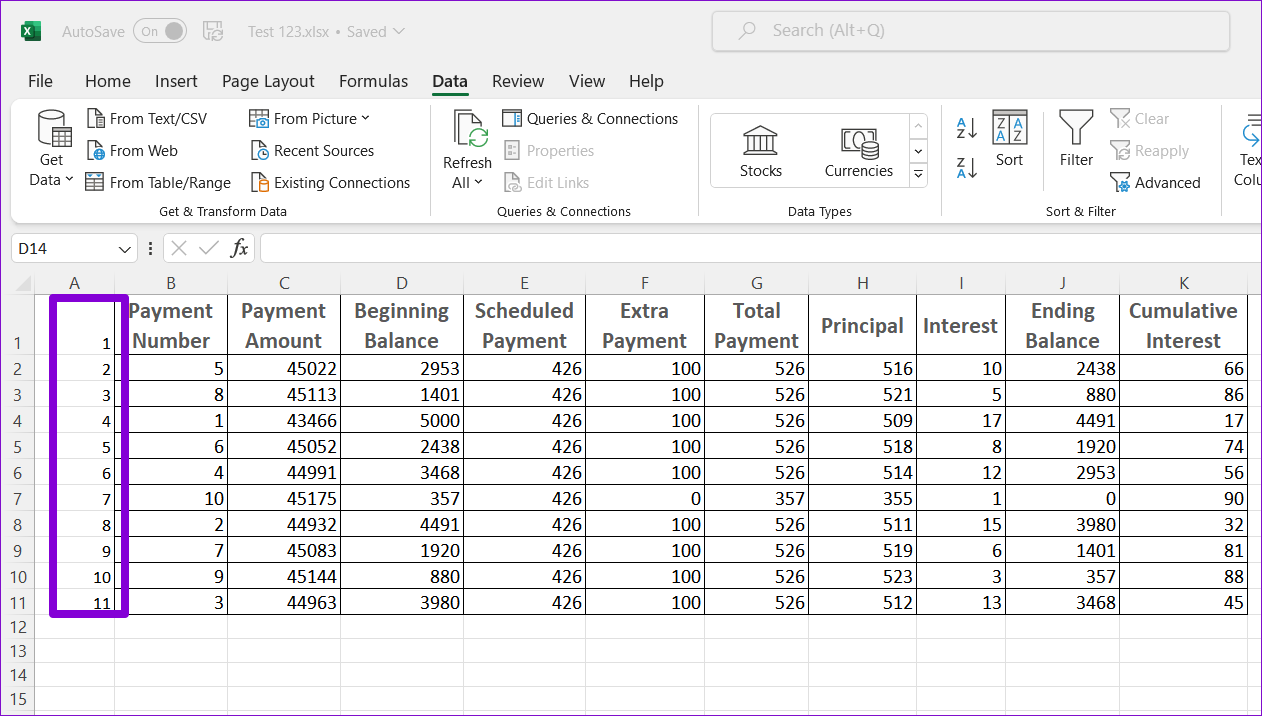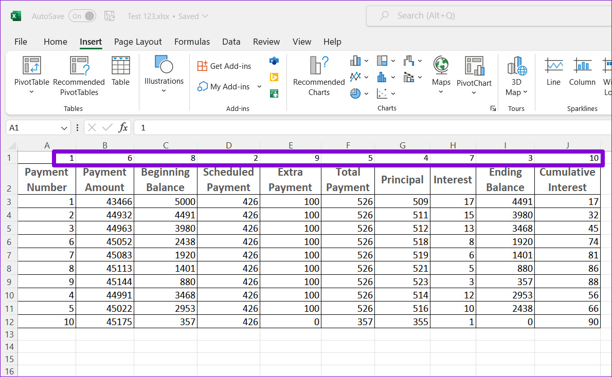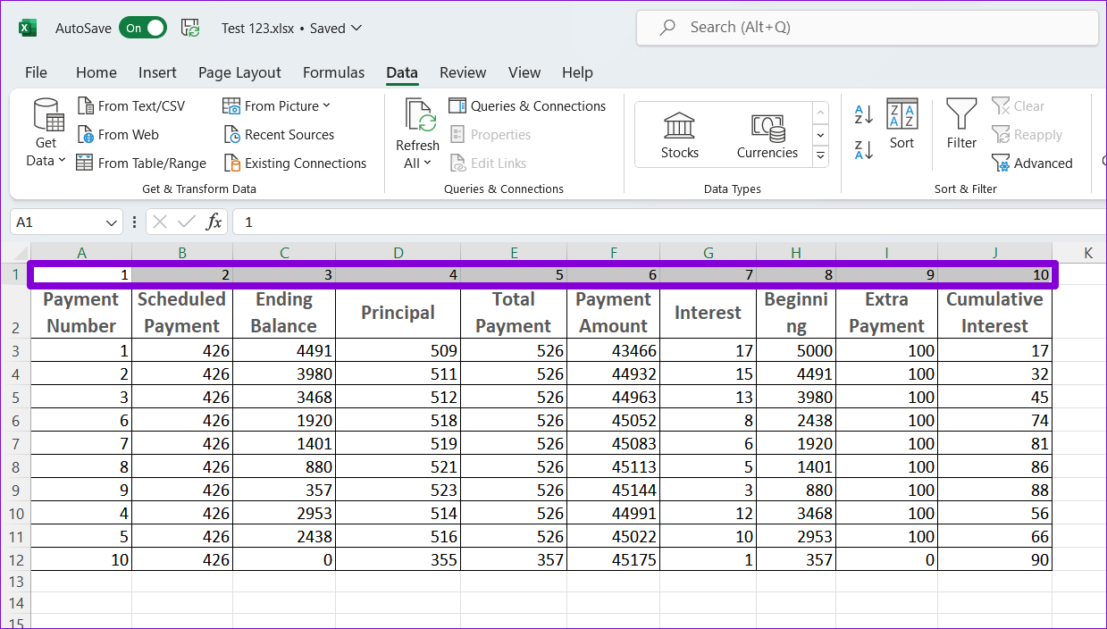 Étape 2 : dans la nouvelle ligne, numérotez les colonnes dans l’ordre dans lequel vous souhaitez qu’elles apparaissent dans la feuille de calcul. Par exemple, si vous souhaitez que la troisième colonne de votre feuille de calcul apparaisse en premier, saisissez 1 dans la cellule au-dessus.