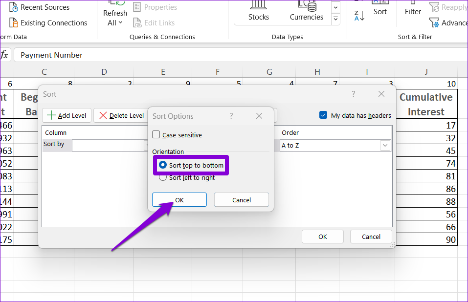 Étape 5 : Sous Orientation, sélectionnez”Trier de haut en bas”et cliquez sur OK.