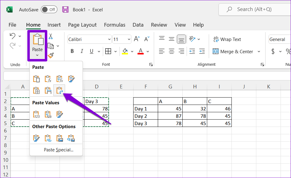 Étape 4 : Dans l’onglet Accueil, sélectionnez l’option Coller option. Ensuite, cliquez sur l’icône Transposer et vous aurez un tableau de données avec les colonnes et les lignes inversées.