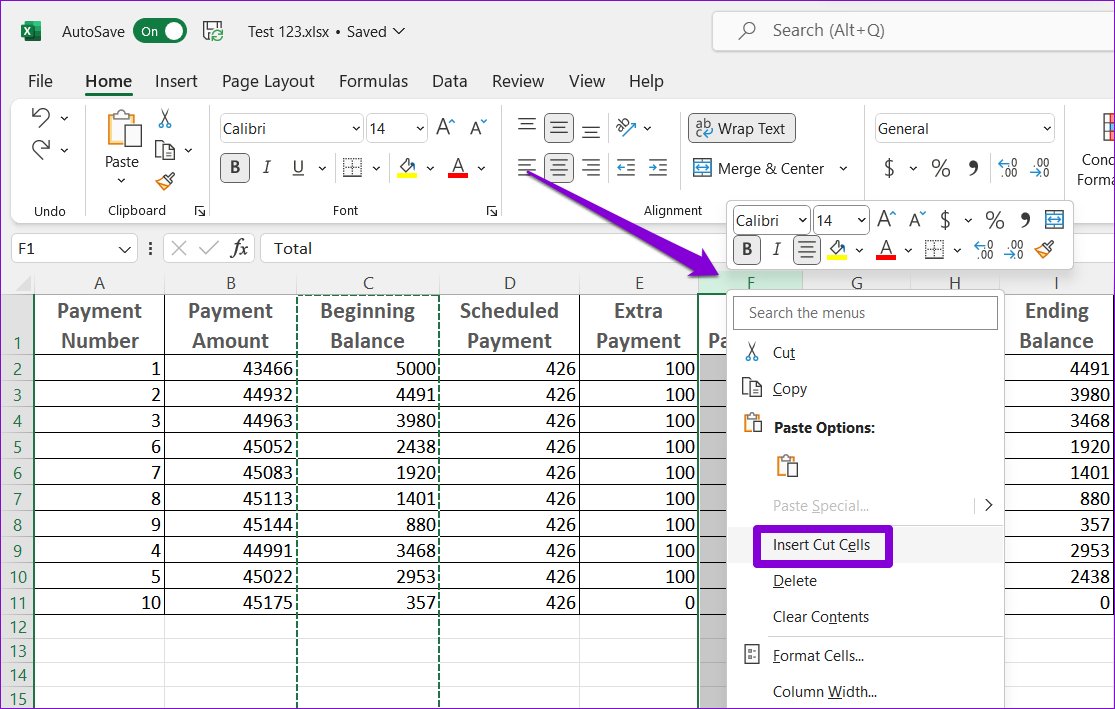 Étape 3 : Si vous déplacez une colonne, mettez en surbrillance la colonne à droite de l’endroit où vous souhaitez placer la colonne coupée. Faites un clic droit dessus et sélectionnez Insérer des cellules coupées.