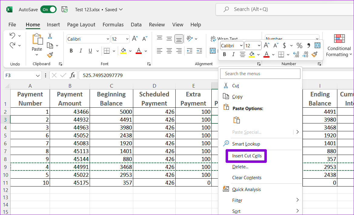 De même, si vous déplacez une ligne, cliquez avec le bouton droit sur la ligne sous la destination souhaitée et sélectionnez Insérer des cellules coupées.