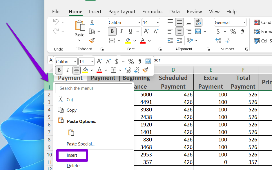 Étape 1 : Faites un clic droit sur la première ligne et sélectionnez Insérer pour ajouter une nouvelle ligne au-dessus de votre tableau.