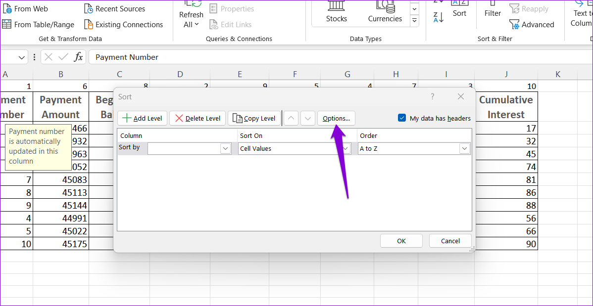 Étape 4 : Dans la boîte de dialogue Trier, cliquez sur Options.