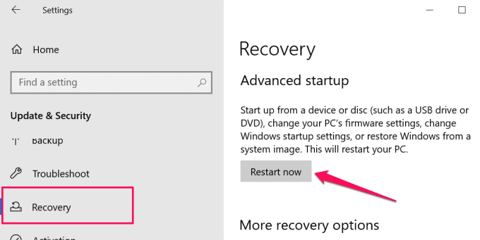 Un autre itinéraire pour démarrer votre PC vers le menu des options avancées est via Paramètres > Mise à jour et sécurité > Récupération et cliquez sur le bouton Bouton Redémarrer maintenant dans la section Démarrage avancé.