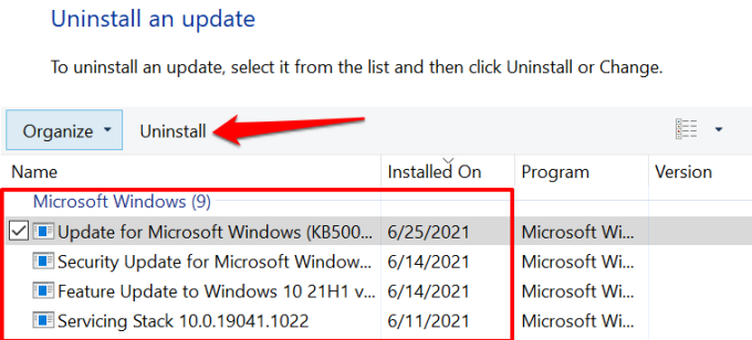 - Sélectionnez la mise à jour et cliquez sur Désinstaller pour continuer. Assurez-vous de vérifier la colonne”Installé le”pour confirmer la date d’installation de la mise à jour problématique.