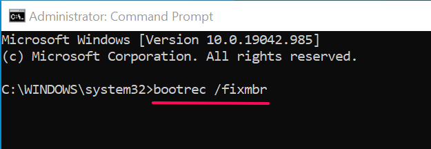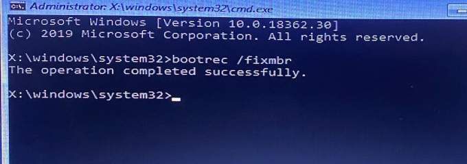 - Tapez ou collez bootrec/fixmbr dans le terminal et appuyez sur Entrée. Passez à l’étape suivante lorsque vous voyez le message « L’opération s’est terminée avec succès ». message.