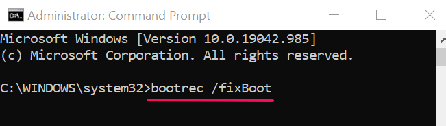 - Ensuite, collez bootrec/fixBoot dans le terminal et appuyez sur Entrée.