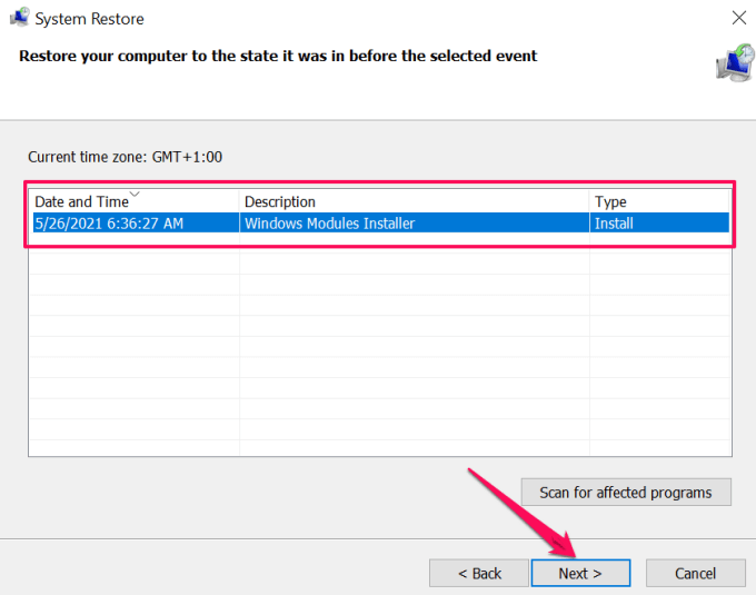 - Sélectionnez le plus récent point de restauration-assurez-vous de vérifier la colonne”Date et heure”. Ou, sélectionnez le point de restauration capturé avant d’installer l’application/le pilote problématique et cliquez sur Suivant.