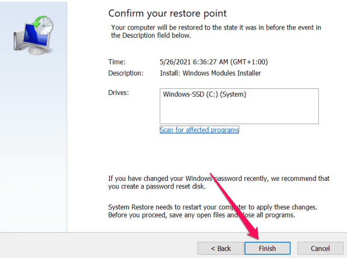 - Si vous le souhaitez, cliquez sur Rechercher les programmes concernés pour afficher les applications que l’outil de restauration du système supprimera de votre ordinateur.