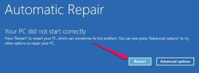 Lorsque Windows affiche cette erreur, vous trouverez deux options à l’écran : Redémarrer et Options avancées. Certains utilisateurs signalent que le redémarrage de leur ordinateur a résolu le problème. Cliquez sur le bouton Redémarrer et attendez que votre PC se rallume.
