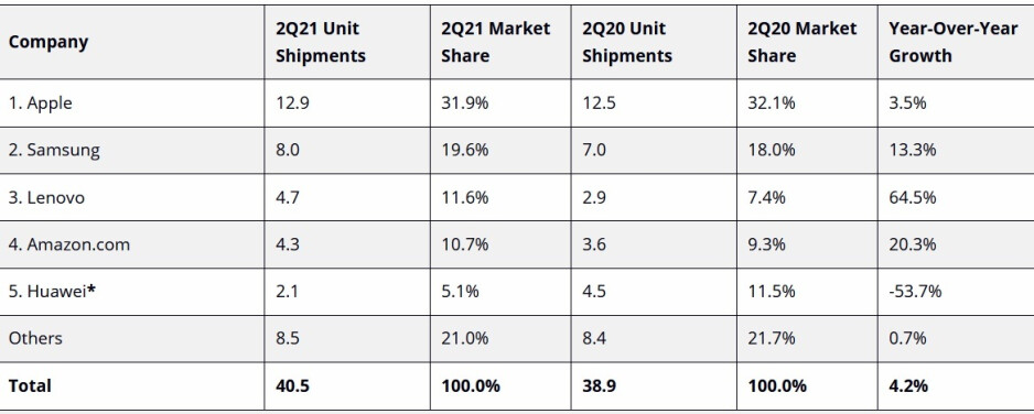 Amazon a enregistré une forte augmentation de 20,3 % d’une année sur l’autre des expéditions de comprimés, passant de 3,6 millions en 2020 à 4,3 millions cette année, selon les estimations d’IDC. Sans compter les tablettes produites l’année dernière par sa sous-unité Honor désormais larguée, Huawei était cinquième avec les ventes estimées de tablettes d’IDC tombant de 53,7%, passant de 4,5 millions à 2,1 millions. Le fabricant assiégé contrôlait 5,1% du marché mondial des tablettes pour le trimestre sur la base de ces chiffres. Si vous incluez les expéditions de tablettes Honor au deuxième trimestre 2020 d’environ 400 000 unités, IDC rapporte que Huawei a enregistré une baisse plus importante de 57,5% des livraisons. au cours du deuxième trimestre de cette année. Au cours des trois mois, un total de 40,5 millions d’ardoises ont été expédiées, contre 38,9 millions livrées au cours de la même période d’avril à juin l’année dernière. Encore une fois, ce sont des chiffres estimés par IDC.