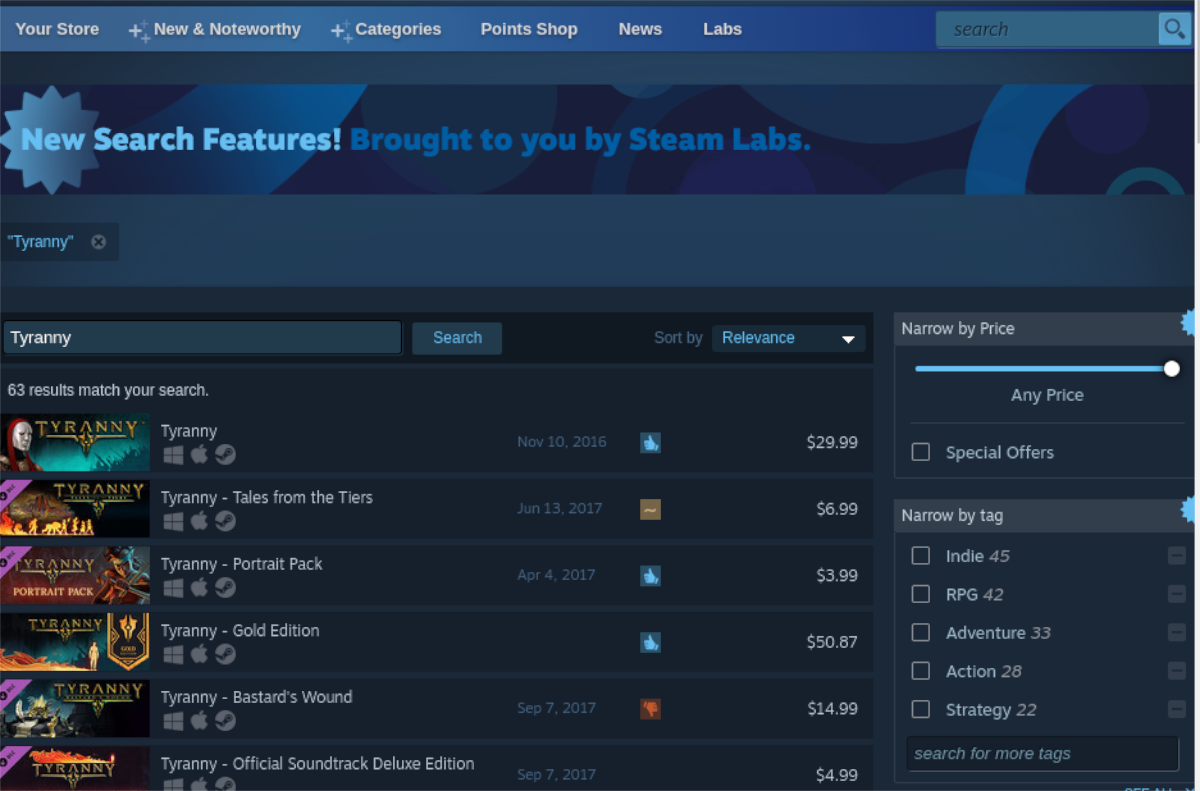 Parcourez les résultats de la recherche pour localiser”Tyrannie”. Ensuite, cliquez sur le jeu dans les résultats de la recherche pour accéder à la page de la boutique Steam de Tyranny.