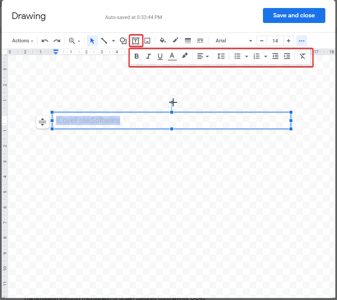 En parcourant ces options, une zone de dessin s’ouvrira dans laquelle vous pourrez personnaliser le filigrane que vous souhaitez ajouter au document. Cliquez sur l’option”T”pour ajouter la zone de texte. Modifiez la zone de texte à l’aide des outils fournis dans la barre d’outils, auxquels vous pouvez accéder en cliquant sur les trois points horizontaux situés à l’extrémité droite de la barre d’outils dans la zone de dessin.