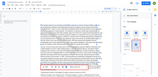 Ça y est, vous verrez le filigrane placé dans le document Google sous la forme d’une image derrière ou devant le texte en fonction de l’option choisie. Vous pouvez également accéder à ces options sous l’image.