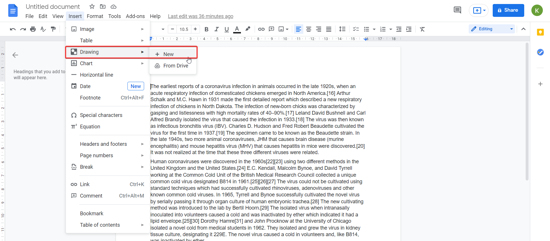 Tout d’abord, vous devrez trier le document Google sur lequel vous souhaitez ajouter un filigrane. Une fois que vous avez ouvert le document Google requis, cliquez sur « Insérer » et recherchez l’option « Dessiner ». Cliquez sur”Dessin”pour accéder à l’option”+ Nouveau”pour créer le filigrane.