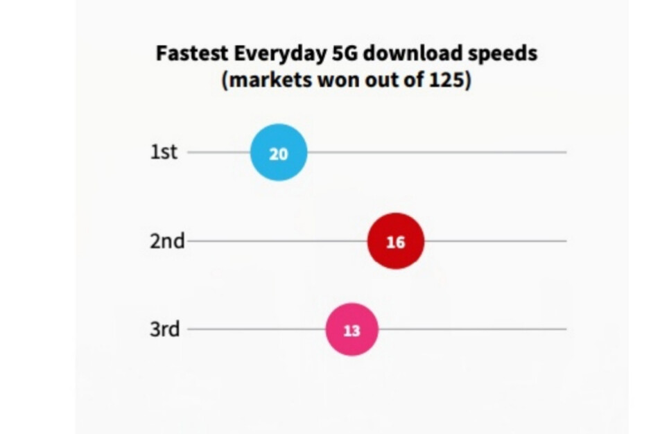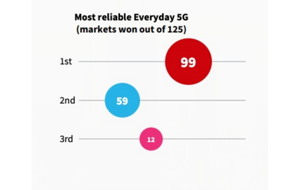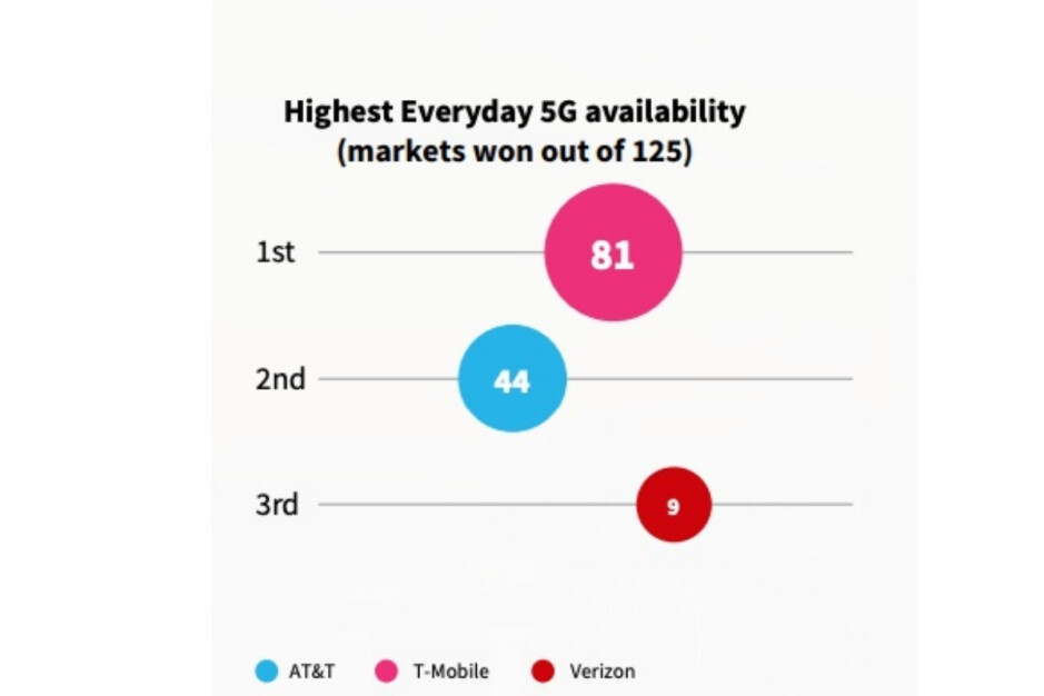 Comme d’habitude, le meilleur 5G de T-Mobile La force réside dans la disponibilité de son réseau, qui l’emporte sur la concurrence dans 81 des 125 marchés clés, un nombre presque deux fois plus important que celui d’AT&T tout en écrasant le total pitoyable de Verizon.