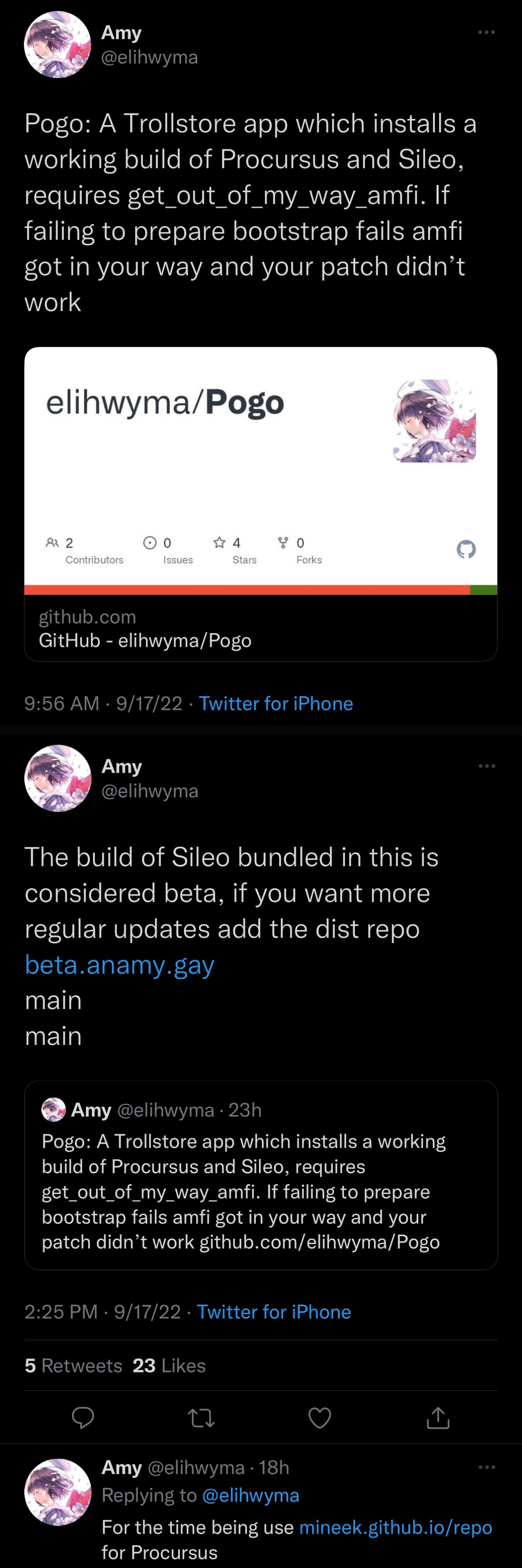 A Pogo lehetővé teszi, hogy a checkm8 exploit-sebezhető eszközzel rendelkezők telepítsenek egy működő Procursus rendszerindítót a Sileo csomagkezelővel együtt. Elméletileg ez lehetővé teszi a jailbreak módosítások telepítését, de fontos szem előtt tartani, hogy jelenleg egyetlen jailbreak-tweak sem támogatja a gyökértelen dinamikát iOS vagy iPadOS 15 rendszeren, ezért a késések az Odyssey Team közelgő Cheyote jailbreakét érintik iOS és iPadOS 15.0 rendszeren.-15.1.1.
