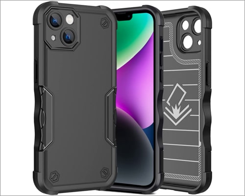 A tok kívül kemény, de belül habréteggel rendelkezik, amely puha marad, így többrétegű kialakítást ad. Ezenkívül beépített támasztékkal is rendelkezik, amely függőlegesen tartja iPhone-ját anélkül, hogy megérintené. Végül vezeték nélküli töltéssel is működik, de a tok gyártója nem javasolja a használatát. Sajnos a MagSafe sem támogatja.