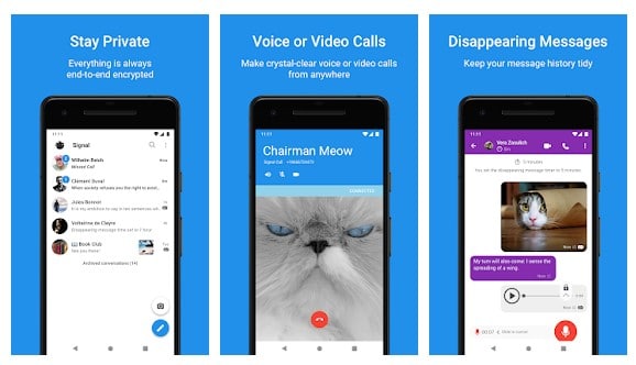 A Signal Private Messenger minden kommunikációs formája végpontokig titkosított, legyen szó szövegről, hangról vagy videóról. hívás. A végpontok közötti titkosításon kívül a Signal Private Messenger önmegsemmisítő üzeneteket is kínál.