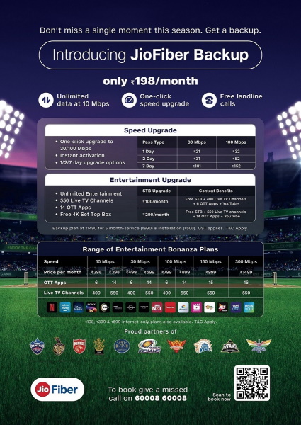 A Jio bevezetett egy új JioFiber Backup tervet, hogy élvezze a tartalmak nézését, különösen a közelgő IPL szezonban minden gond nélkül. Az új biztonsági mentési terv korlátlan adatforgalmat és további jutalmakat biztosít, havi 200 Rs alatti áron, és alternatív internetkapcsolatként működik. Ez azután történt, hogy a telco nemrégiben bemutatta a Jio Cricket terveit. Nézze meg az alábbi részleteket.