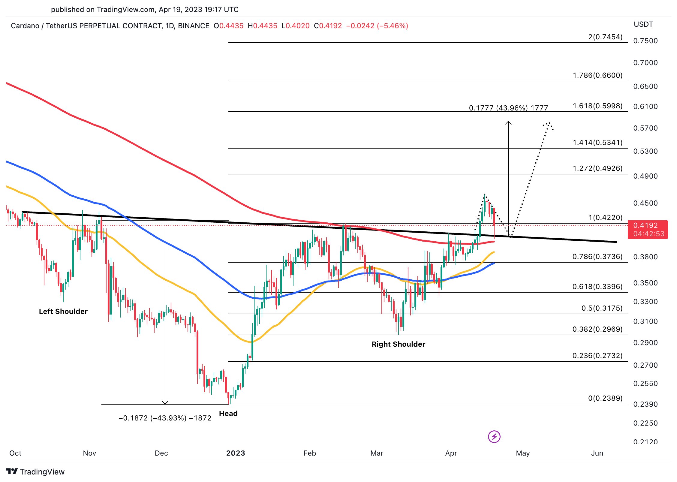 A legutóbbi korrekció egy bullish újratesztnek tűnik, mielőtt az ADA elérné ennek az inverz head & shoulders formációnak a célját. Ennek ellenére a napi grafikon 0,39 dolláros 200EMA-jának tartania kell az ADA-t, hogy a bullish kilátás érvényben maradjon.