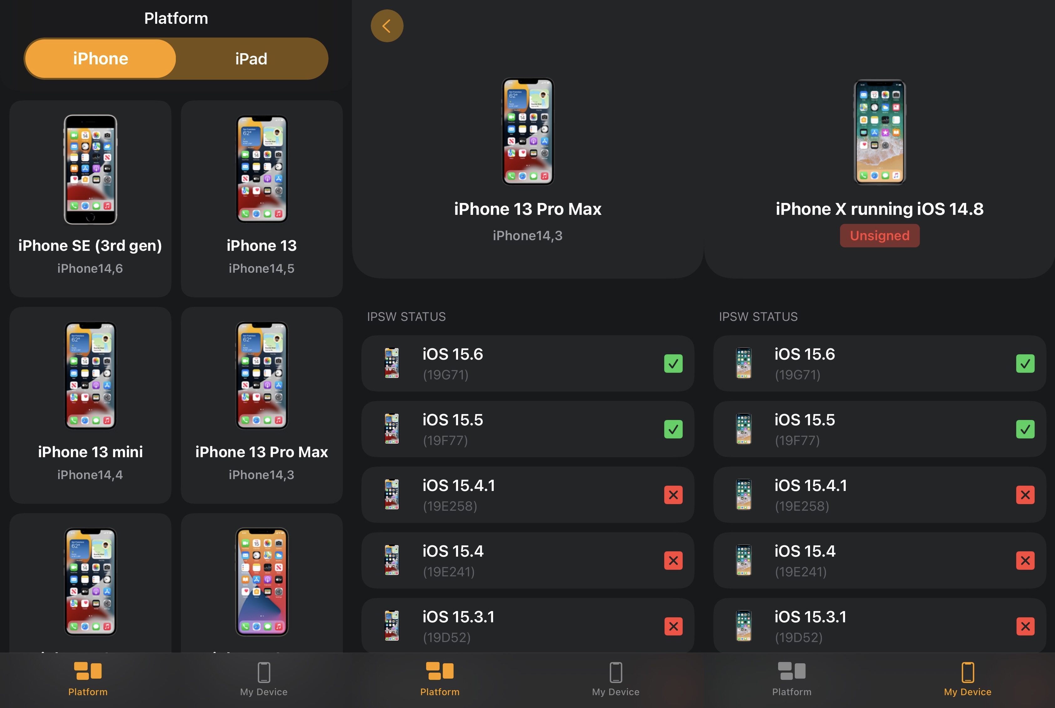 A telepítés után elindíthatja az alkalmazást, és elkezdheti koppintani a kívánt eszköztípust, hogy megtudja, melyik verzió(k) iOS vagy iPadOS alá van írva vagy nincs aláírva egy adott eszközön.