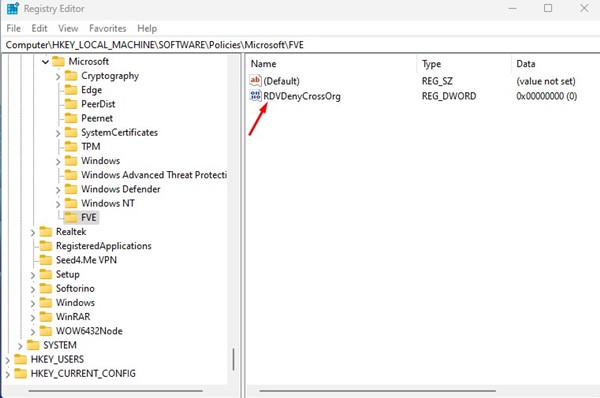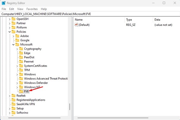 4. Ezután nevezze el az újonnan létrehozott kulcsot FVE néven.