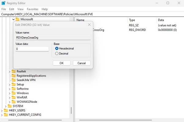 7. Most kattintson duplán az RDVDenyCrossOrg elemre, és az Érték mezőbe írja be a következőket: