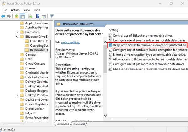 3. Most a jobb oldalon kattintson duplán a Írási hozzáférés megtagadása a BitLocker által nem védett cserélhető meghajtókra házirendre.
