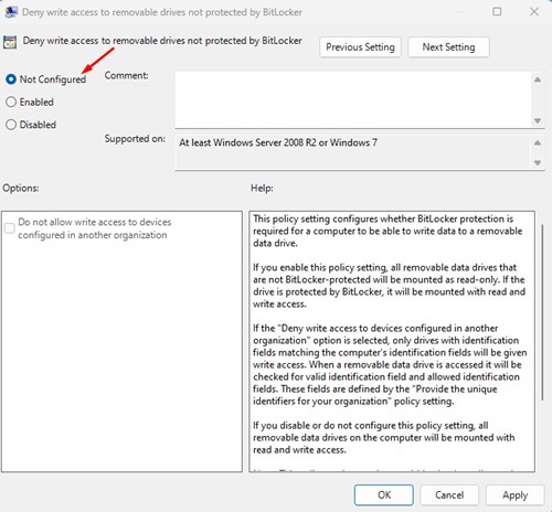 5. Ha vissza szeretné kapni az írási hozzáférést, válassza a „Letiltva” vagy a „Nincs konfigurálva” lehetőséget, majd kattintson az Alkalmaz gombra.