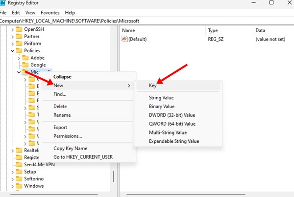 3. Kattintson a jobb gombbal a Microsoft mappára, és válassza az Új > Kulcs lehetőséget.