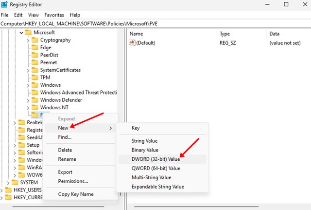 5. Kattintson jobb gombbal az FVE mappára, és válassza az Új > DWORD (32 bites) értéke lehetőséget.