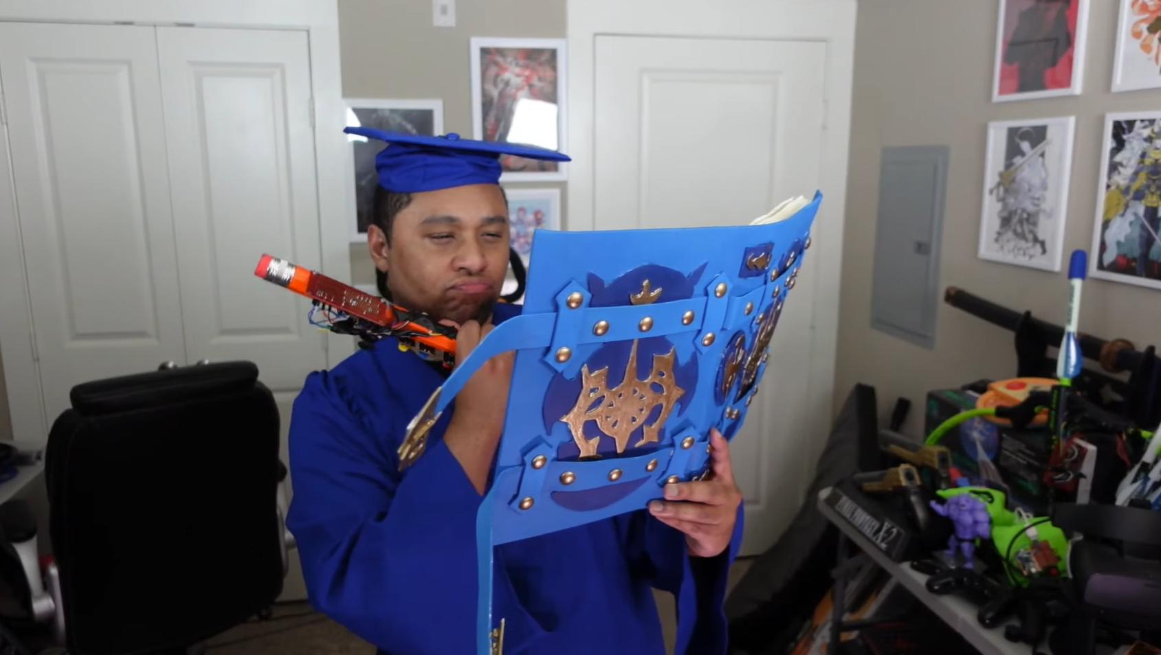 kék köntösbe és ballagási sapkába öltözött Super Louis 64 pedig a legújabb létrehozása – a Könyvvezérlő. A streamer nem csak a varázslat szórakoztató elsajátítására törekedett, hanem arra is törekedett, hogy játékélményét egy kicsit karakterhűbbé tegye.
