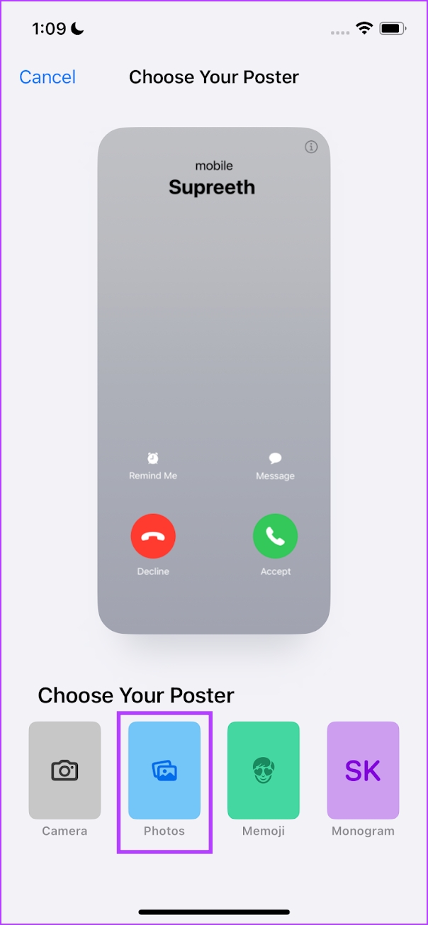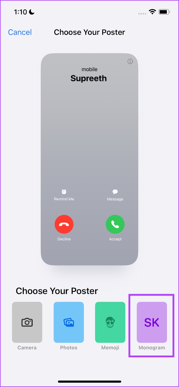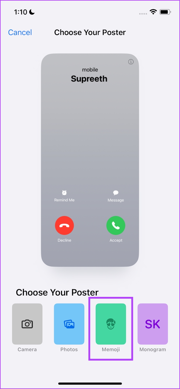 Langkah 4: Pilih apakah Anda ingin membuat poster Foto, Memoji, atau poster Monogram untuk kontak tersebut. Ikuti prosedur di bagian sebelumnya untuk membuat poster kontak.