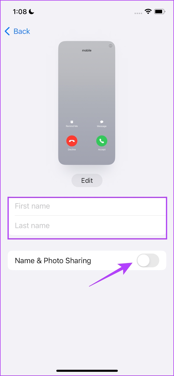 Langkah 4: Aktifkan sakelar untuk’Berbagi Nama & Foto’.