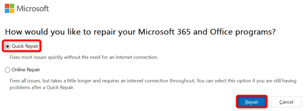 Jika Anda terus melihat kode kesalahan 0x800ccc0e di Outlook, file inti aplikasi mungkin rusak. Anda tidak dapat memperbaiki sendiri file ini, jadi gunakan alat perbaikan bawaan Microsoft Office untuk menemukan dan memperbaiki semua masalah dengan aplikasi Office Anda, termasuk Outlook.