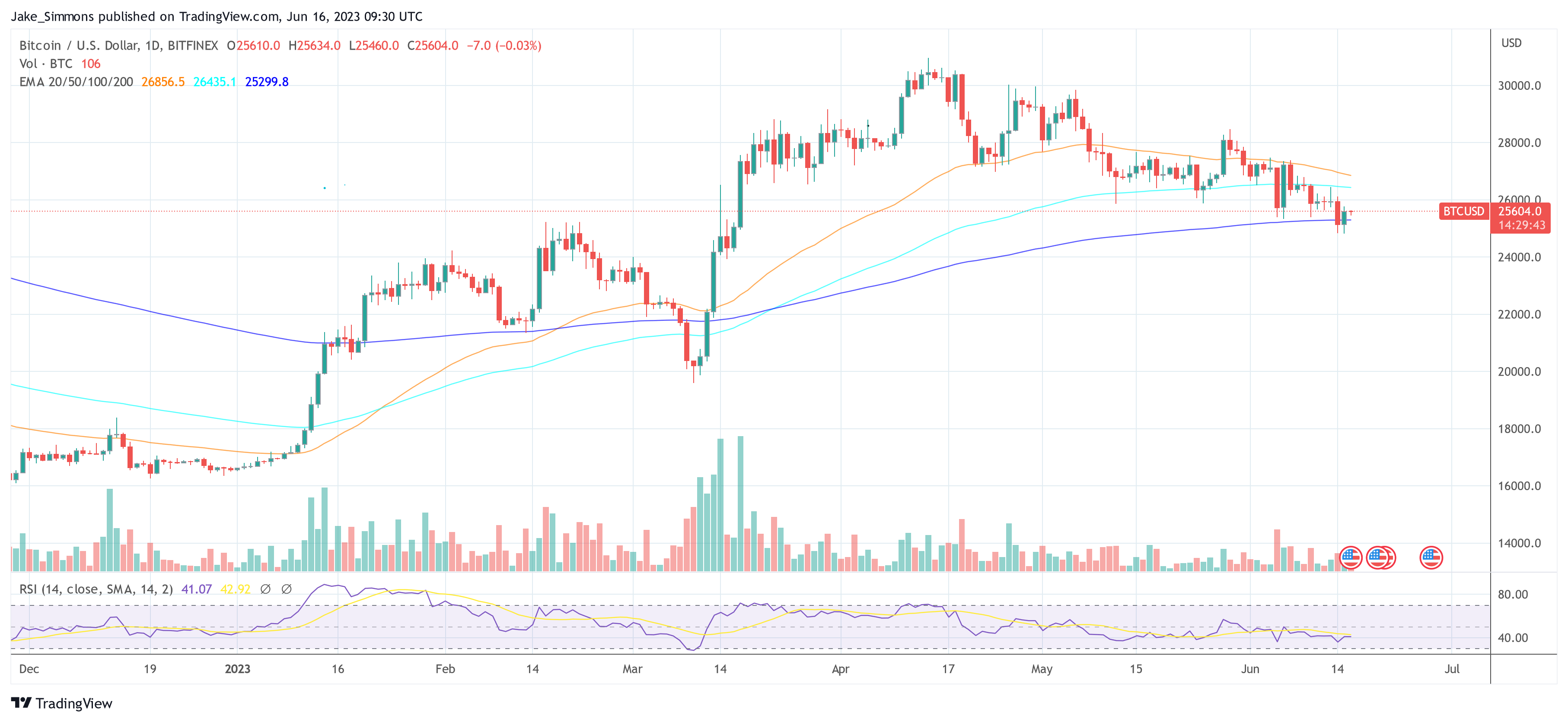 Pada waktu pers, BTC diperdagangkan pada $25.604, mengklaim kembali EMA 200 hari (garis biru).