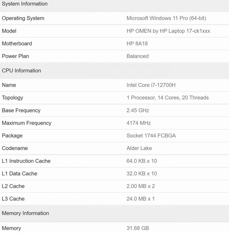 Spesifikasi Intel Core i7-12700H, Sumber: Geekbench