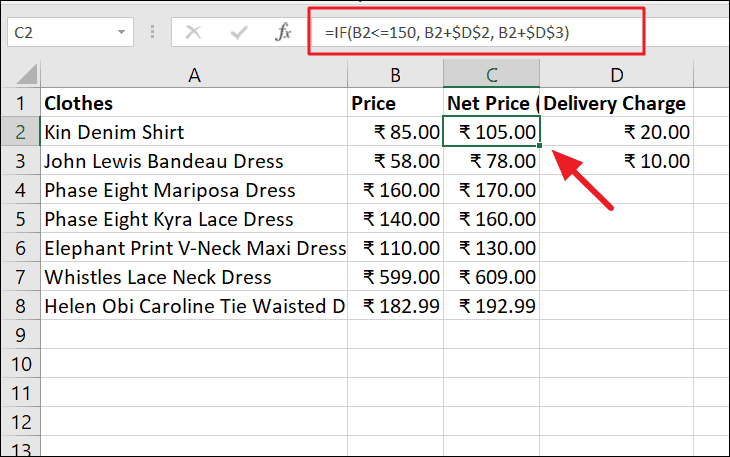 =IF(B2<=150, B2+$D$2, B2+$D$3)