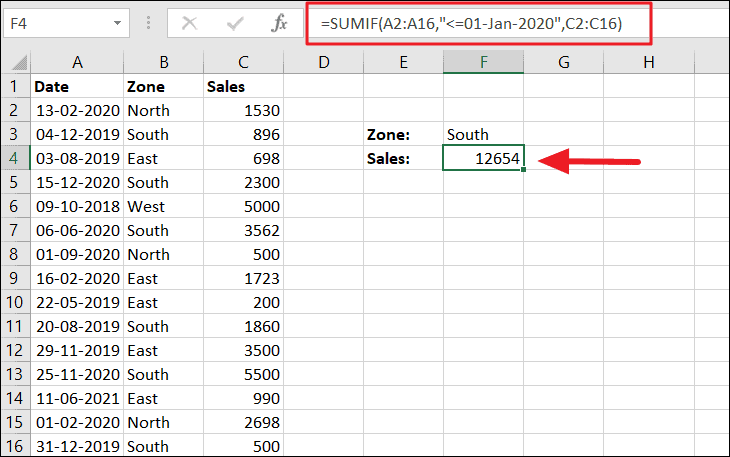=SUMIF(A2:A16,"<=01-Jan-2020",C2:C16)
