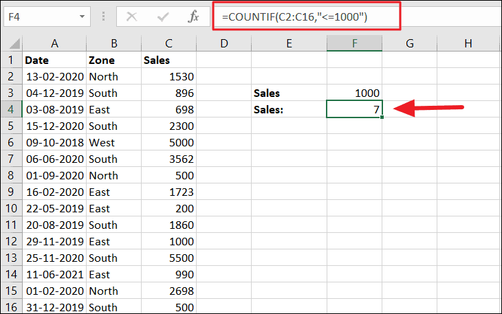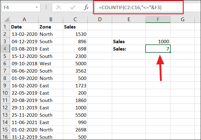 Menggunakan ‘<=’ dengan Fungsi COUNTIF di Excel