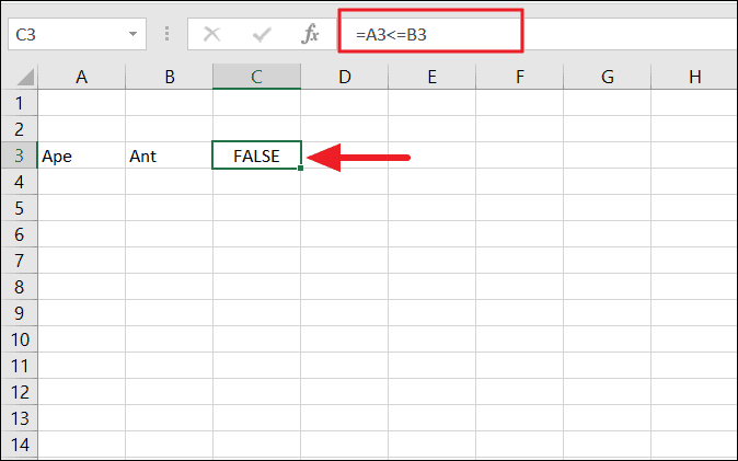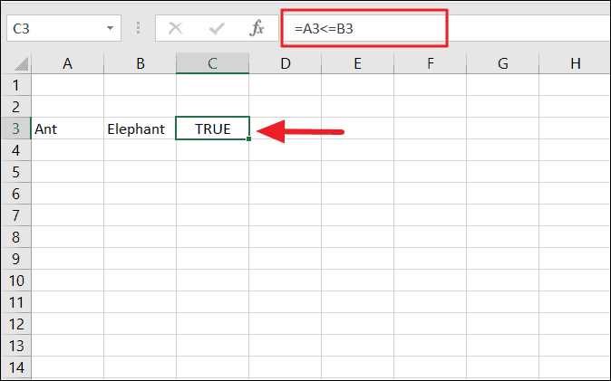 Pada contoh di bawah, teks “Semut” jelas tidak sama dengan “Gajah”. Jadi Anda mungkin bertanya-tanya, tapi bagaimana Semut lebih kecil dari Gajah? Apakah karena kecil? Tidak, huruf pertama sel A3 (“A”) lebih kecil dari huruf pertama sel B3 (“E”).