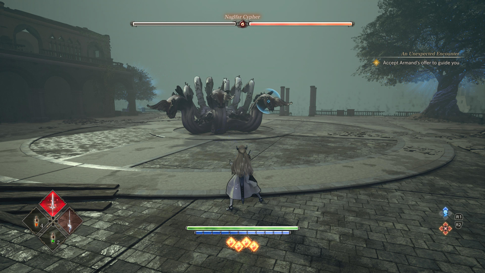 Infine, diamo un’occhiata al combattimento. Ho visto persone online dire che è la grazia salvifica di questo gioco. In apparenza, il combattimento in Valkyrie Elysium sembra essere uno di quei tipi di configurazioni complicate, facili da imparare e difficili da padroneggiare. Ma quando ho effettivamente scavato nel gioco e ho sbloccato più dell’arsenale di Valkyrie, ho scoperto che non si evolve davvero oltre un semplice hack’n’slash a due pulsanti nonostante tutto sia stato gettato nel mix.