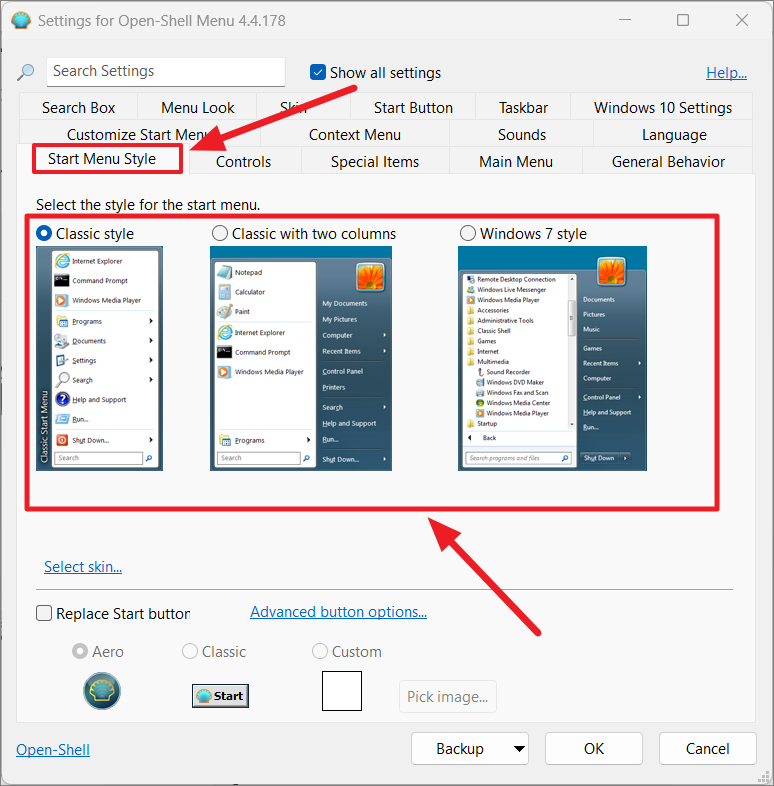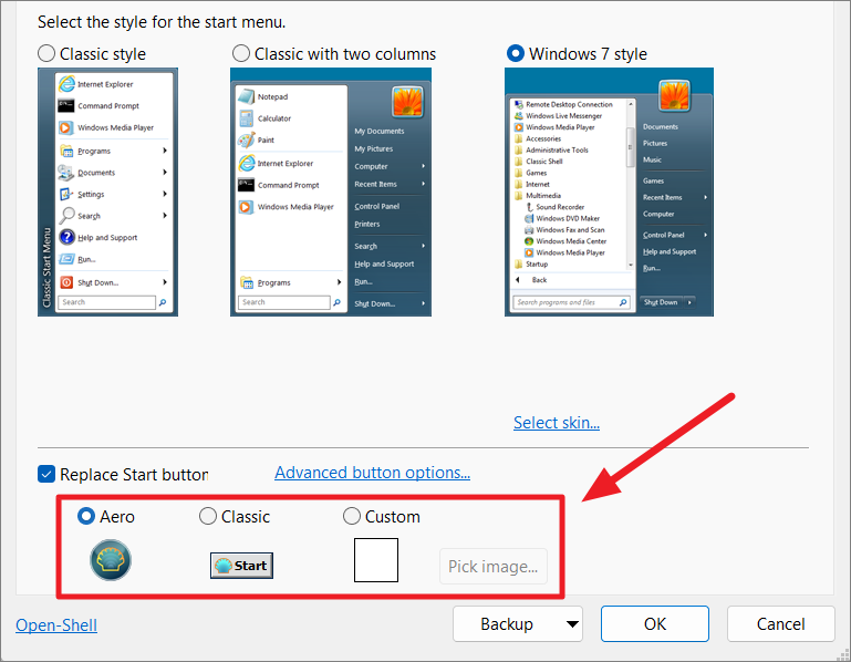After choosing the start menu style, seleziona la casella”Sostituisci pulsante Start”. Quindi, seleziona una delle icone del menu di avvio.”Aero”è l’affidabile pulsante del menu Start con l’icona Open Shell. Then, click’OK’to apply the settings.