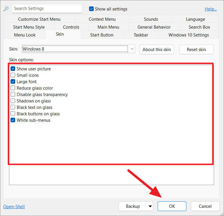 Once selezioni la skin, avrai un elenco di opzioni di seguito che possono aiutarti a personalizzare ulteriormente l’aspetto del tuo menu di avvio. Semplicemente, seleziona o deseleziona le opzioni per modificare le impostazioni.