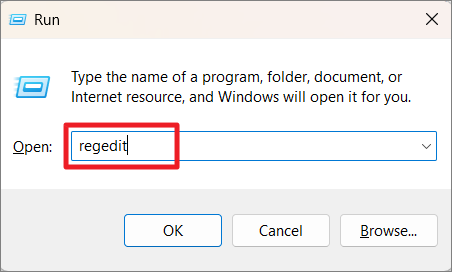 Press Win+R keyboard shortcut keys to open the Run box, type in regedit, and click ‘OK’.