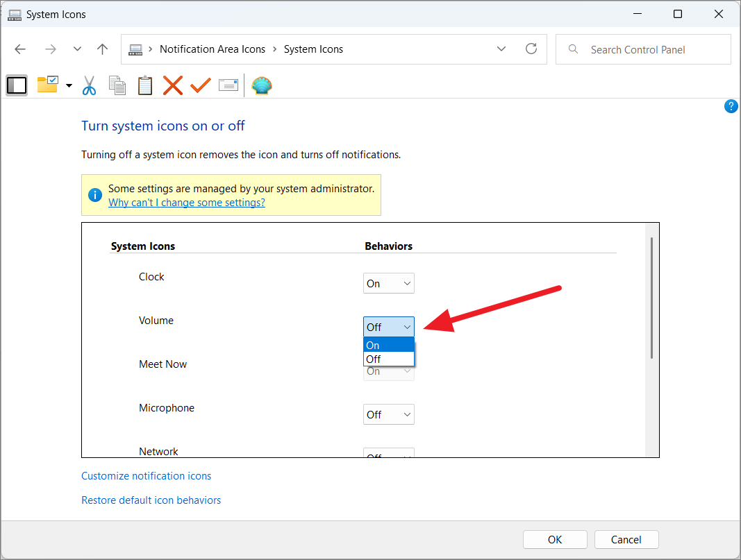 In the next window, toggle Volume, Clock, Network, Battery, and Action Center icons using the respective drop-down menus. Then, click’OK’to save the changes.