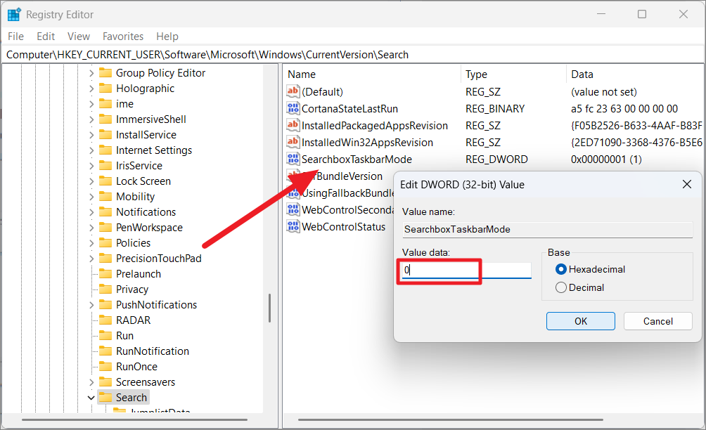 Then, locate the registry named’SearchTaskbarMode’on the right side pane and change its value to 0.